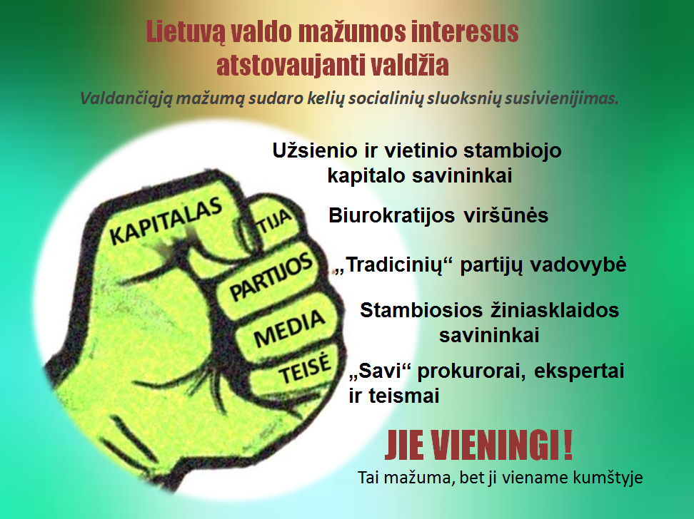 Taigi šalį valdo absoliuti gyventojų mažuma. O dauguma – iš savo darbo gyvenantys žmonės (ar jau išėję pensijon) – neturi balso šioje valstybėje. Tai visi samdomo fizinio ir protinio darbo darbuotojai. Tai ir smulkūs verslininkai. Ir eiliniai tarnautojai. Ir inteligentija. Ir valstietija. Ir bedarbiai.