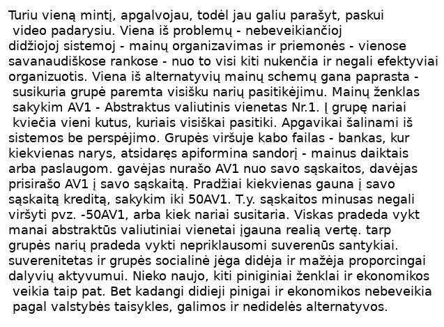 Sava ekonomika, arba alternatyva dabartinei sistemai. Šią sistemą nori nenori teks prisiminti, kai grynieji pinigai bus išimti iš apyvartos. Svarbiausia, kad tokiu principu veikianti sistema gali būti sukurta kiekvienoje gyvenvietėje...